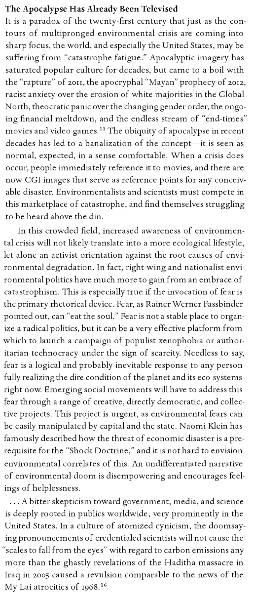 Towards the end of the video, the camera spanned the auditorium and I could see all the empty seats. There were perhaps a few dozen people in attendance of Guy’s talk. That’s a sad commentary on society, but it also points to something else – catastrophe fatigue or the normalization of catastrophe. The slow and steady stream of doomsday news along with the popularizing of such themes in mainstream entertainment and pop culture has served to desensitize people to catastrophe and violence: