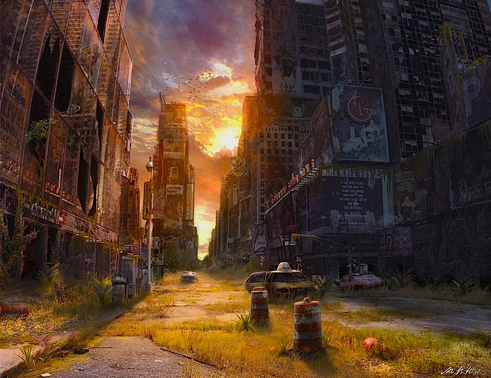 I thought I’d post a few pictures of what the world will look like before the end of this century. Artists have the intuitive imagination to conjure up such visions the general public can only imagine through Hollywood zombie flicks which seem to be all the rage these days. Why do I feel this vision is inevitable? Just look at the daily news to see what I mean: