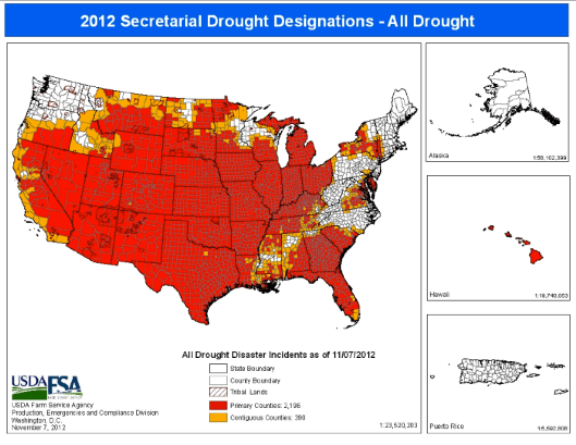 Drought Disaster Designations Map (PDF, 504KB) Text-only (accessible) version Map shows designations due to drought across the country under USDA’s amended rule. Any county declared a primary (red) or contiguous (orange) disaster county makes producers in that county eligible for certain emergency aid.