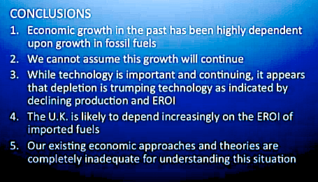 I featured Professor Charles Hall in EROEI and the Collapse of Empires and here he is again with another interesting talk on energy and EROEI to clear away all the bullshit headlines about America becoming the “New Saudi Arabia”. Our economy simply cannot grow anymore without energy inputs that have a high EROEI. Of course you also have to take into account the environmental externalities of fossil fuels which are writing the epitaph on our tombstones – “Homo Sapiens had more fossil fuels than brains. Mother Nature tried to warn them, but their addiction was too strong and their propaganda too pervasive.”