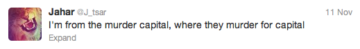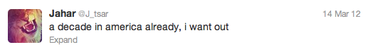I was poking around the twitter account of Dzhokhar ‘Jahar’ Tsarnaev and found some ironic and disturbing reflections on life in America. With the morbid fascination our throwaway culture has with its own social atrocities, perhaps it’s not so odd that ‘Jahar’ now has nearly 85,000 followers.