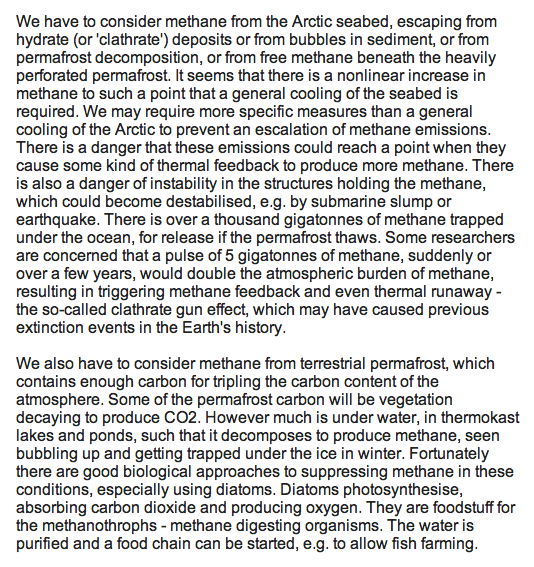 Despite AMEG’s(Arctic Emergency Methane Group) techno-narcissist support of geoengineering our way out of this environmental crisis, they are one of the more clear-minded groups of scientists when it comes to the severity of our civilization-ending predicament. Here are excerpts from a presentation given by AMEG at the “Davos Atmosphere and Cryosphere Assembly DACA13”, July 12, 2013:
