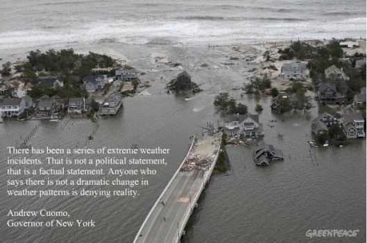 Though the cost of Sandy to the Northeast is a small fraction of the total cost incurred by Katrina, this time climate change hit the seat of power and money in America rather than the poverty-stricken plebs of New Orleans who were quickly written off.
