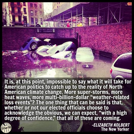 Meanwhile the insurers, Swiss Re(the big one), and Munich Re, set their numbers folk on the problem and come up with a price(premium) for geographically weak areas around the planet. The price for living in say, flood prone Manhattan, will be determined by these numbers. Fire risk, no problem, theft, no problem – but acts of nature, well the historical data is on our side, to a degree where no one can dispute it, as is the call of the world’s foremost climate experts, which governments ought not argue with. Consequently the premium for flood and tempest will be high – Indeed very high. Do you want this element of our insurance coverage? – and by all means try another insurer. They will tell you the same thing. A bit like going to bat for a fair priced earthquake cover in Christchurch at the moment, let alone in the decades to come.